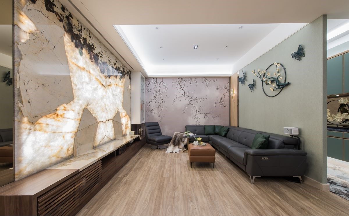 玄關(guān)鋪陳雪山藍(lán)大理石地坪,與一旁運(yùn)用青花瓷打造的大理石臺面與藝術(shù)品陳列,交織出雅致非凡的迎賓風(fēng)尚;以窯燒玻璃與鐵件搭建一道頂天的屏風(fēng),穿透的肌理讓光線可自在流淌一室,且結(jié)合180度旋轉(zhuǎn)的活動設(shè)計(jì),可依需求調(diào)整立面位子,達(dá)到避開風(fēng)水禁忌的疑慮。電視墻以絕美石材打造,鮮明的獨(dú)特肌理與色澤,搭配兩面背墻分別以枝葉花卉壁紙,與蝴蝶裝置藝術(shù)的自然語匯,特調(diào)出無限自然生命力。