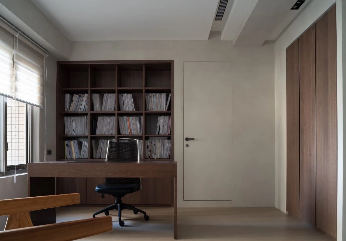 210平的辦公空間位于舊商辦大樓中,原始空間有天花板低矮、采光和動線不良的問題。在改造上,整體場域使用特殊涂料做為主建材,使墻面具有獨特的手感紋理;設計師考量到新創(chuàng)公司的辦公風氣開放,每一位員工不一定需要固定的座位,更重視的是彼此的交流與互動,因此舍棄使用一般的OA家具,在采光最好處,安排開放式的公共空間及大長桌,做為員工可自由辦公與相互溝通之所。交流區(qū)規(guī)劃有圓形桌幾,讓人與人可以圍聚在此,一旁建物不可規(guī)避的結構凹槽處則設有造型書架,修飾畸零角落也讓此處成為獨特的端景,長桌處與茶水吧臺結合,既能做為員工的用餐區(qū),也可是開放式的用辦公空間,另外,通過深色的鋼刷木皮,圍塑出部分員工的座位區(qū),保有隱私及個人空間。