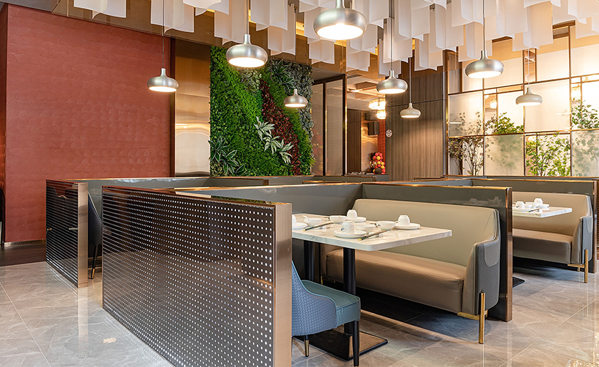 用餐區(qū)采用 “卡座 + 散臺(tái) + 包間” 組合,散臺(tái)間距不小于 1.2 米,包間預(yù)留獨(dú)立備餐位,提升私密性。