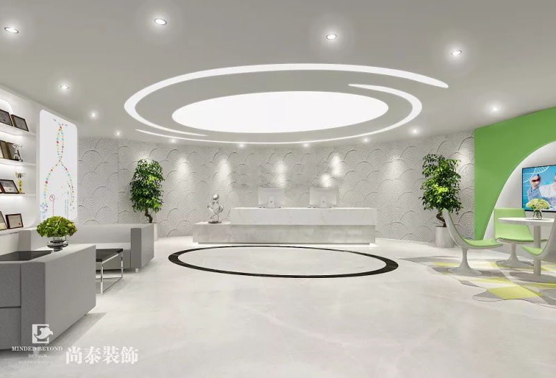 因科技生物美容垂直人群多為年輕時尚的女性,所以設計師在前廳這一塊的體現(xiàn)出國際化和高端的流線型空間。