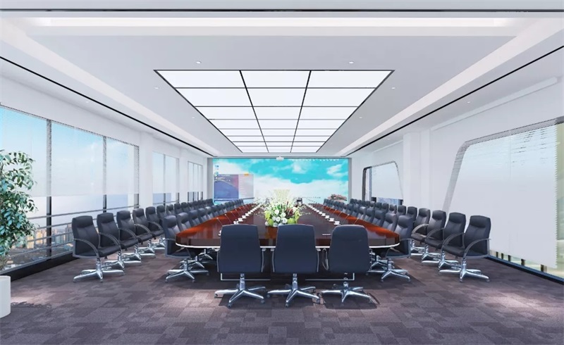 會議室的設(shè)計(jì)采用了大面積的落地窗設(shè)計(jì),加上天花板的燈光,可以使得視覺上得到延伸。