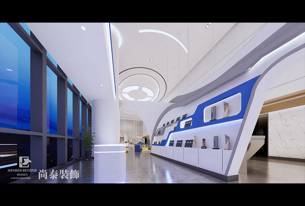 前廳、展廳等公共區(qū)域多以造型彰顯企業(yè)氣質,冷暖結合,曲直相交,