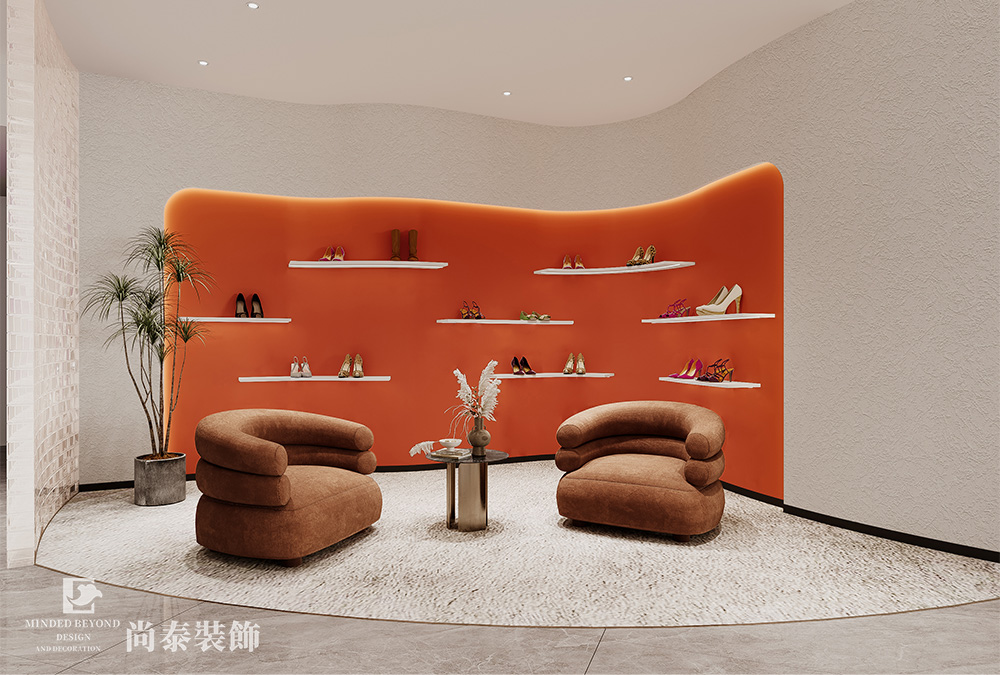 休閑區(qū)位于前廳背景墻后方,流線型展柜設(shè)計(jì),鮮艷的橘紅色與素雅墻面色形成強(qiáng)烈的視覺對比,再次彰顯公司產(chǎn)品,搭配頗有設(shè)計(jì)感的休閑椅茶幾,格調(diào)高端而熱烈。直播區(qū)位于玻璃磚墻后方,同樣采用橘紅色突出展柜,每一個(gè)展品都如珍品,通過直播的形式展現(xiàn)在觀眾前。
