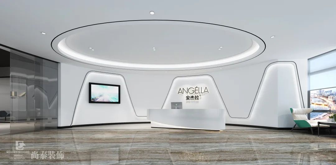 前廳天花采用黑色圓形與燈帶結(jié)合的形式,做出直播“補(bǔ)光燈”的效果,與公司直播帶貨的企業(yè)文化高度融合。