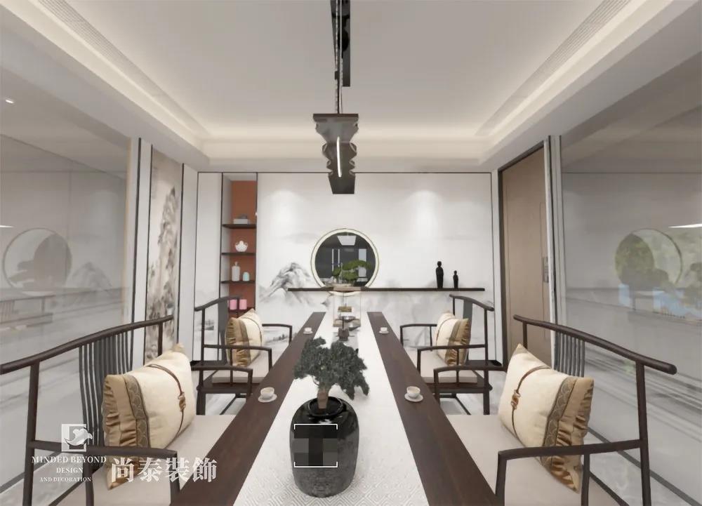 董事長(zhǎng)室大量采用“紅木家具、山水藝術(shù)畫”等中式元素,室內(nèi)天花的輕奢風(fēng)設(shè)計(jì)與中式元素相碰撞,既顯空間沉穩(wěn)格調(diào)又透著空間奢華韻味。