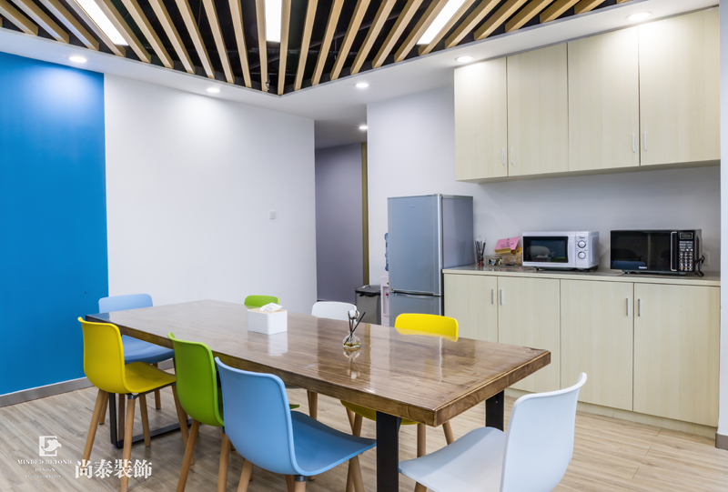 水吧,作為員工經(jīng)常出入的一個地方,讓辦公累了的時候,進(jìn)來接一下水,整個感覺都不一樣了,疲勞也消失了。作為水吧,除了飲水機(jī),應(yīng)該還有冰箱、微波爐、冰箱等,真正的做到了物盡其用,五顏六色的椅子,藍(lán)白相接的粉刷,如大海一般。