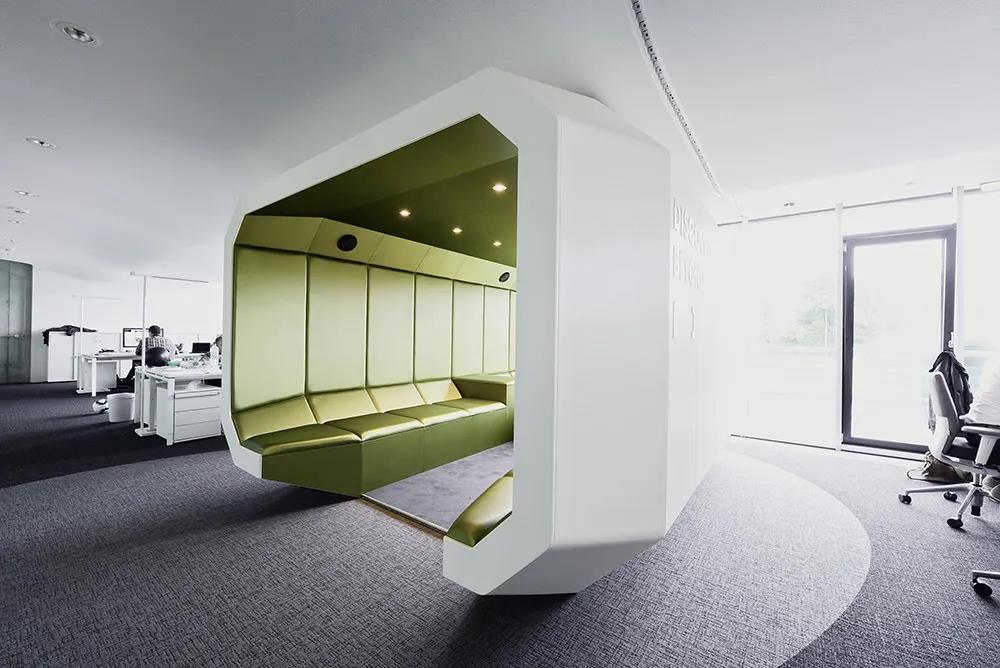 到了休閑區(qū),在灰色調(diào)中營造出一個白色空間,吊頂和地板相對應(yīng),橘色作為點亮色,還有不規(guī)則圍合起來的沙發(fā)式坐椅,營造出一種科技風(fēng)的感腳,另一邊有個白色造型的休閑空間,里面是一個半開放的包廂,空間內(nèi)的綠色讓人感到舒適放松。