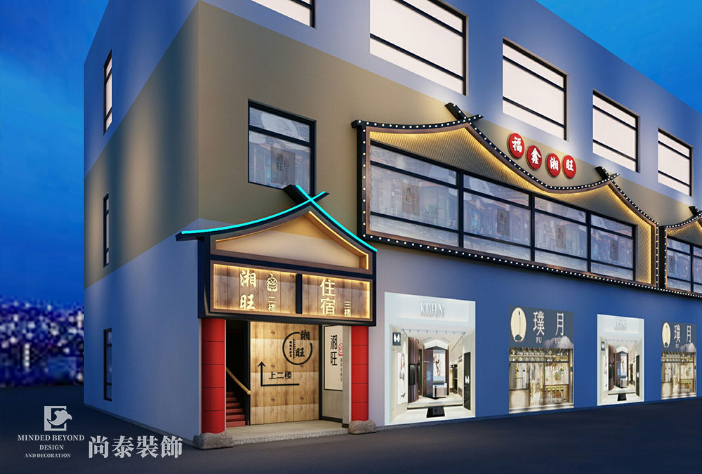 福鑫湘旺餐廳位于光明區(qū)一個(gè)街道城中村一棟3層樓的二層,人流量很客觀,兩邊都有樓梯可以上去。門頭這塊需要考慮兩邊都要有招牌,所以我們?cè)诙右徽麑幼隽宋蓓斣煨团荞R燈連接兩邊的門頭,整個(gè)招牌連成一體顯得很大氣,有很顯眼。造型延用農(nóng)村造型屋頂,體現(xiàn)農(nóng)家菜的飲食文化。