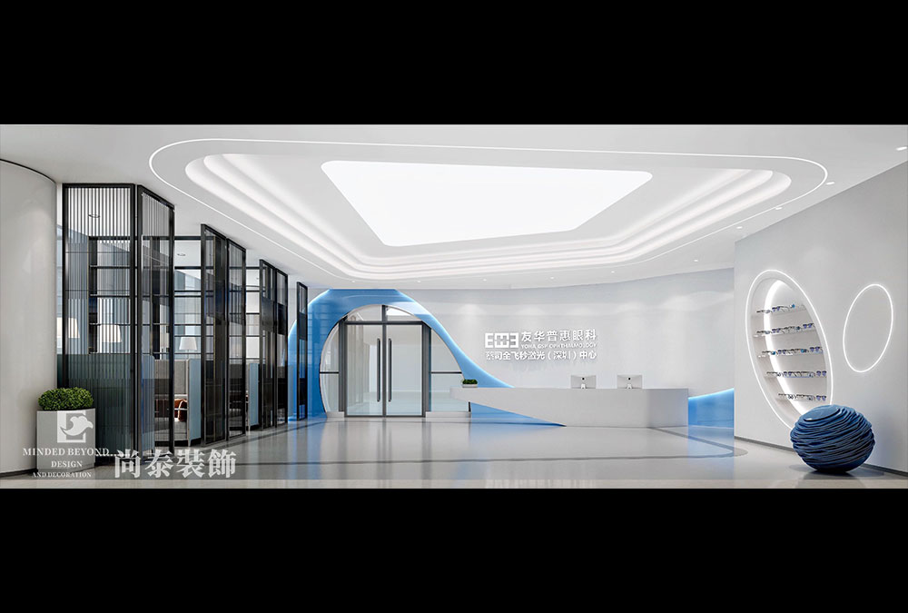 本案為高端眼科門診部門店裝修設(shè)計,項目位于深圳羅湖區(qū)商業(yè)中心,深圳裝修公司尚泰裝飾設(shè)計師以極簡為設(shè)計基調(diào),以弧線形為造型,打造柔和溫馨,純潔自然的診療空間。本案在空間形象設(shè)計上摒棄了傳統(tǒng)醫(yī)療空間的硬朗線條,取而代之的是各種弧形線條設(shè)計,搭配氣質(zhì)感極佳的軟裝和人體工程學(xué)家具,給患者營造舒適親切的診療環(huán)境。整體以大面積的留白為底色,充分表達(dá)空間的張力,輔以藍(lán)色、暖色為部分空間的視覺貫穿,氛圍感極強(qiáng),充分體現(xiàn)人文關(guān)懷。