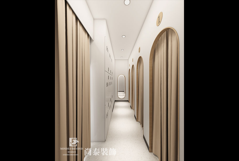 教室是舞蹈教育培訓(xùn)的核心區(qū)域,寬大的鏡面給學(xué)員舞蹈形體學(xué)習(xí)提供便利,并拓展了視覺上的空間感;吊頂裸頂噴漆,顏色與墻面一致;造型燈具為空間提供明亮的光源,提升藝術(shù)質(zhì)感;換衣間采用私密設(shè)計,秩序井然。