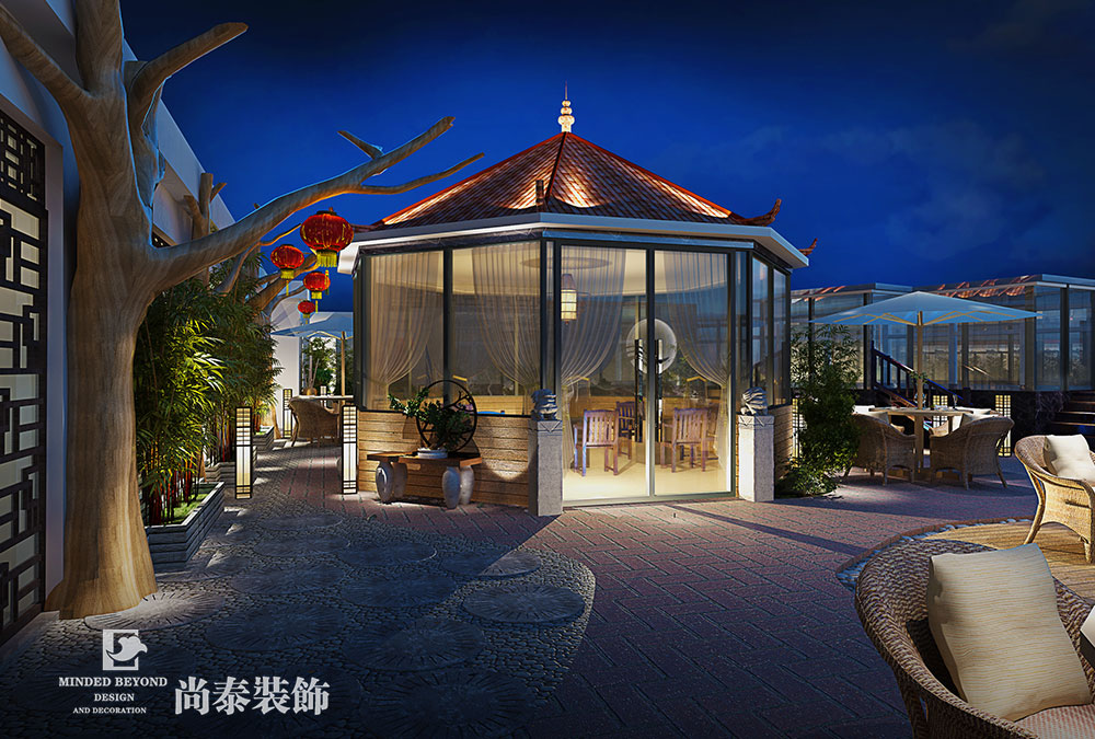 采用經(jīng)典中式設計風格,嫻熟運用中式裝飾元素,如青磚、燈籠、實木桌椅、圓形拱門、古典字畫、中式園林景觀造型等